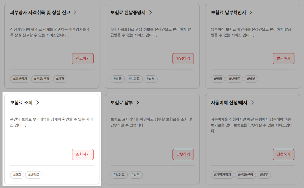 c. 스크롤을 내리거나 검색창을 통해 [보험료 조회]를 찾아 선택합니다.