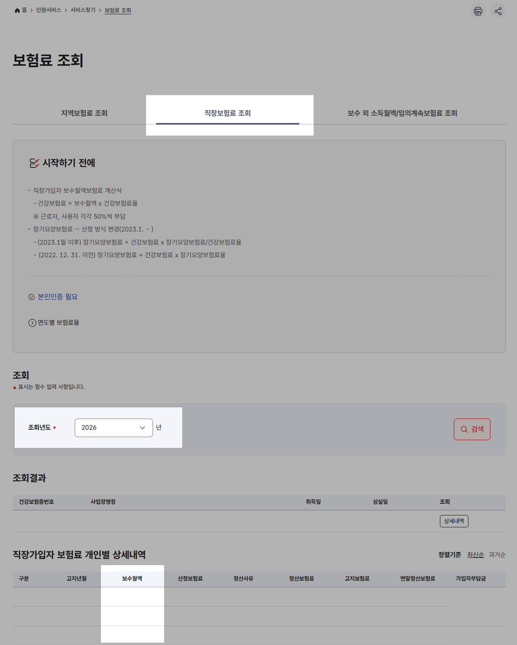 d. [직장보험료 조회]에서 조회년도를 선택하고 아래에 보이는 보수월액을 확인합니다.