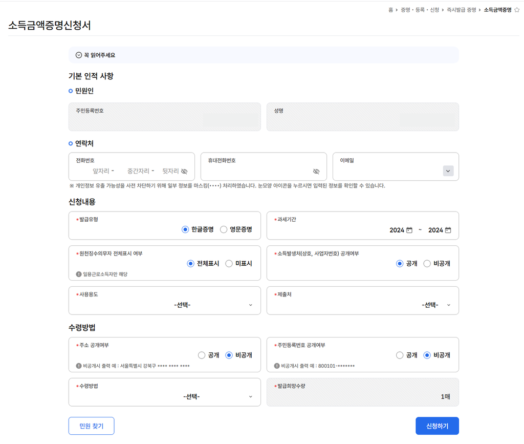 c. 아래 보이는 인적 사항과 신청 내용, 수령방법 등을 본인의 맞게 기입한 후 [신청하기]를 선택합니다.