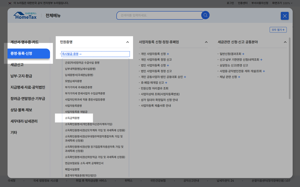 b. 우측 전체메뉴에서 [증명·등록·신청] - [즉시발급 증명] - [소득금액증명]을 선택합니다.