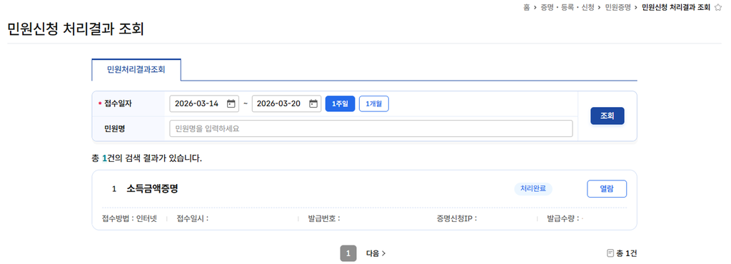 d. 이후 [민원신청 처리결과 조회]에서 자신이 발급한 소득 금액증명원을 확인할 수 있습니다.