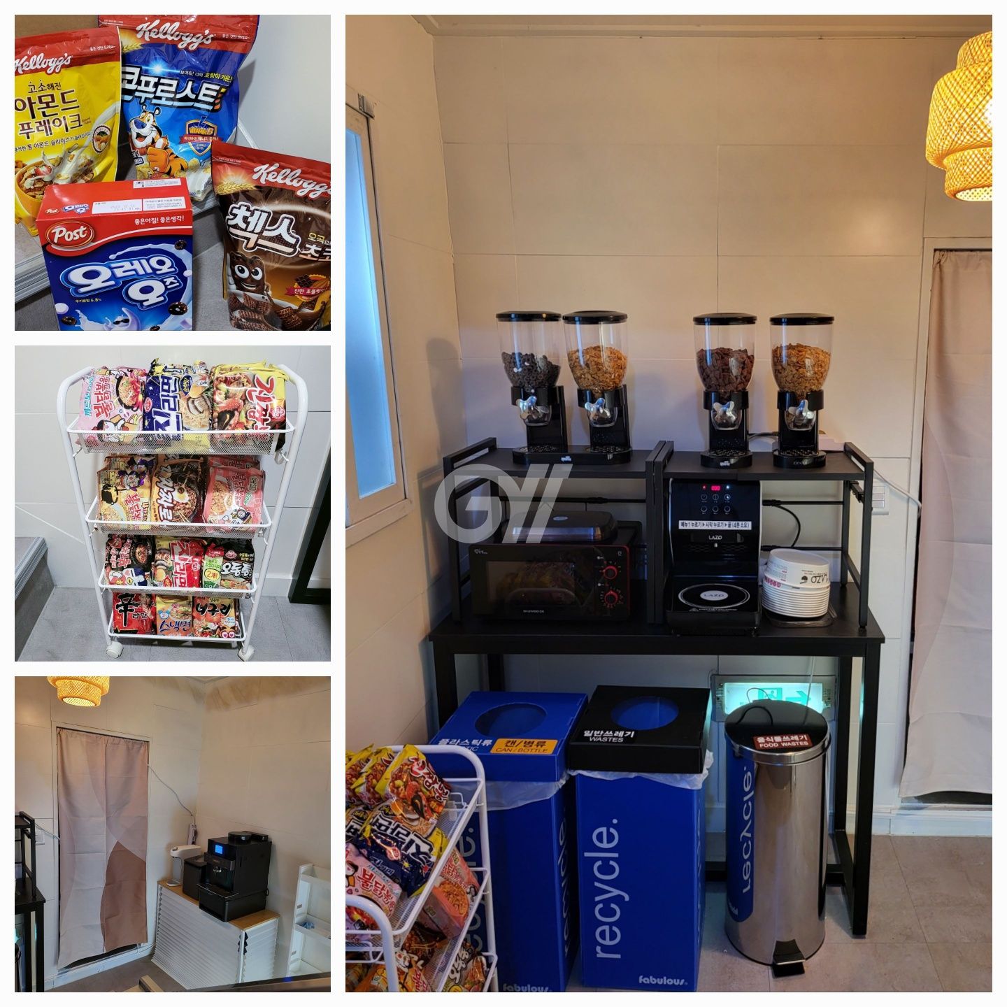 공용냉장고, 인덕션, 전자레인지, 전기밥솥, 토스트기, 커피머신, 정수기, 조리도구