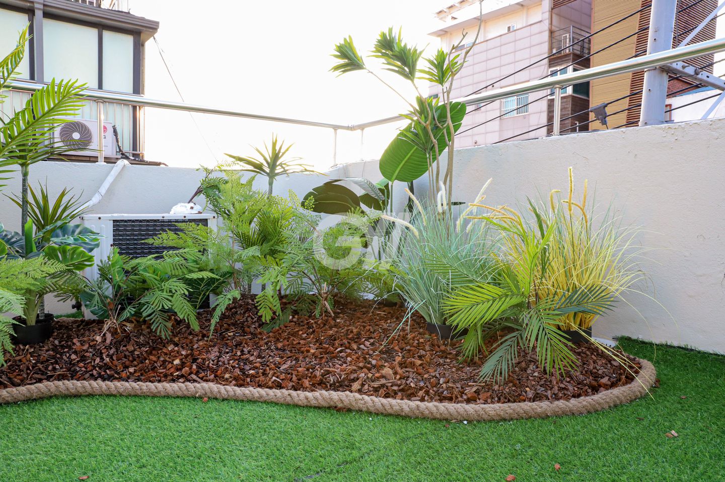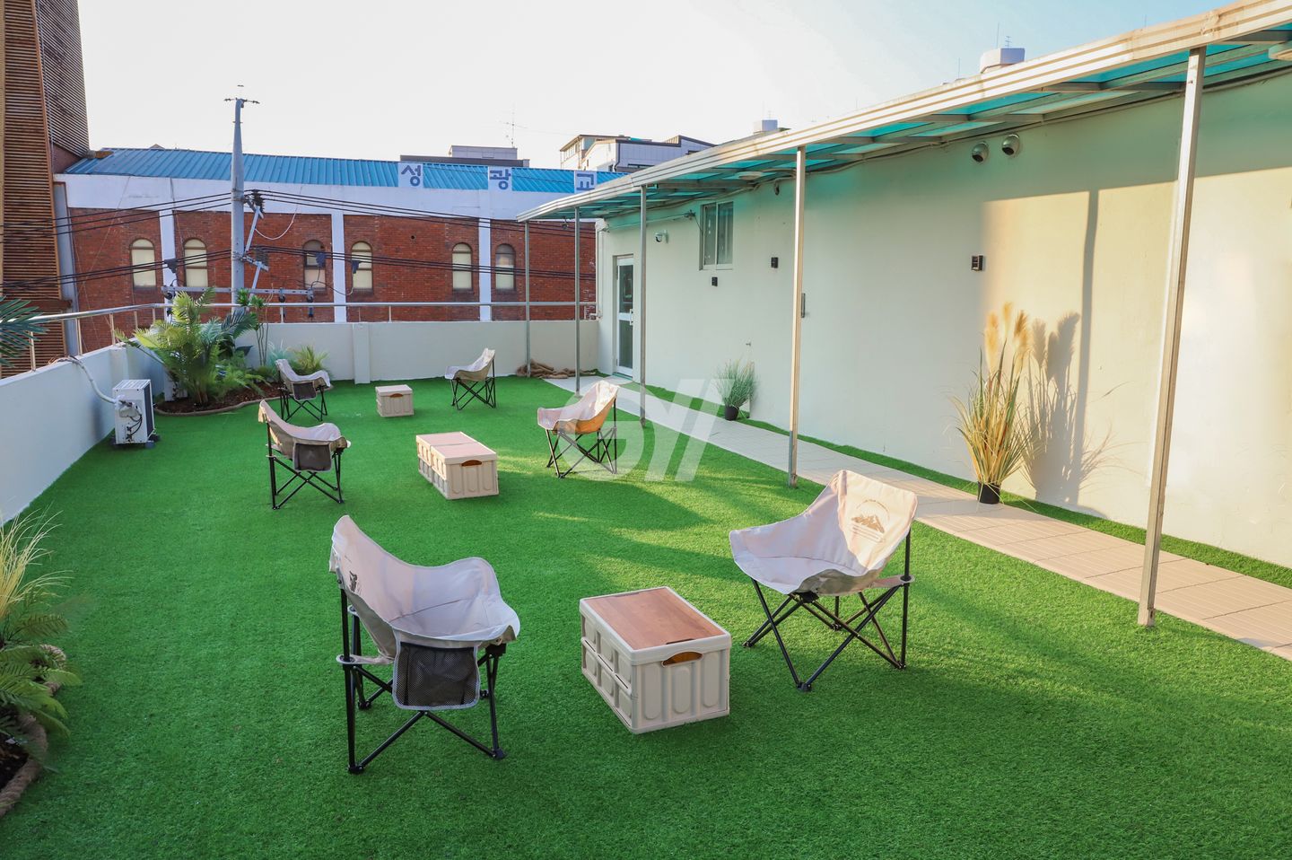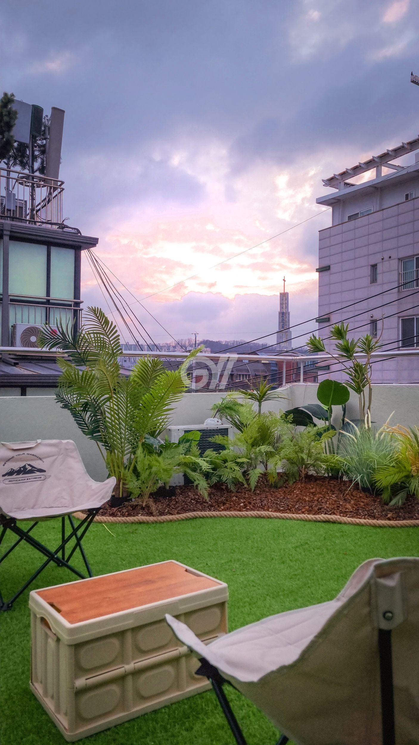 눕눕 하우스의 최고 자랑거리에요. 서울의 낭만을 듬뿍 느낄 수 있는 옥탑 잔디 정원이 준비되어 있어요. 힐링이 필요할 때 이곳에서 저녁에 맥주 한잔하면 한강 나들이 부럽지 않아요.