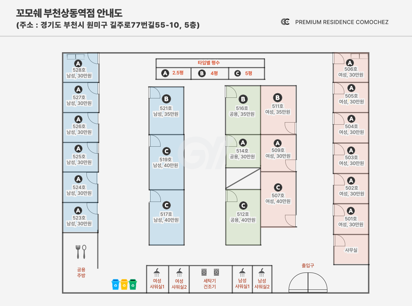 기업에서 운영하는 안전하고 청결한 합리적인숙소! 꼬모쉐 부천상동역점입니다. (부천상동역 도보 3분)