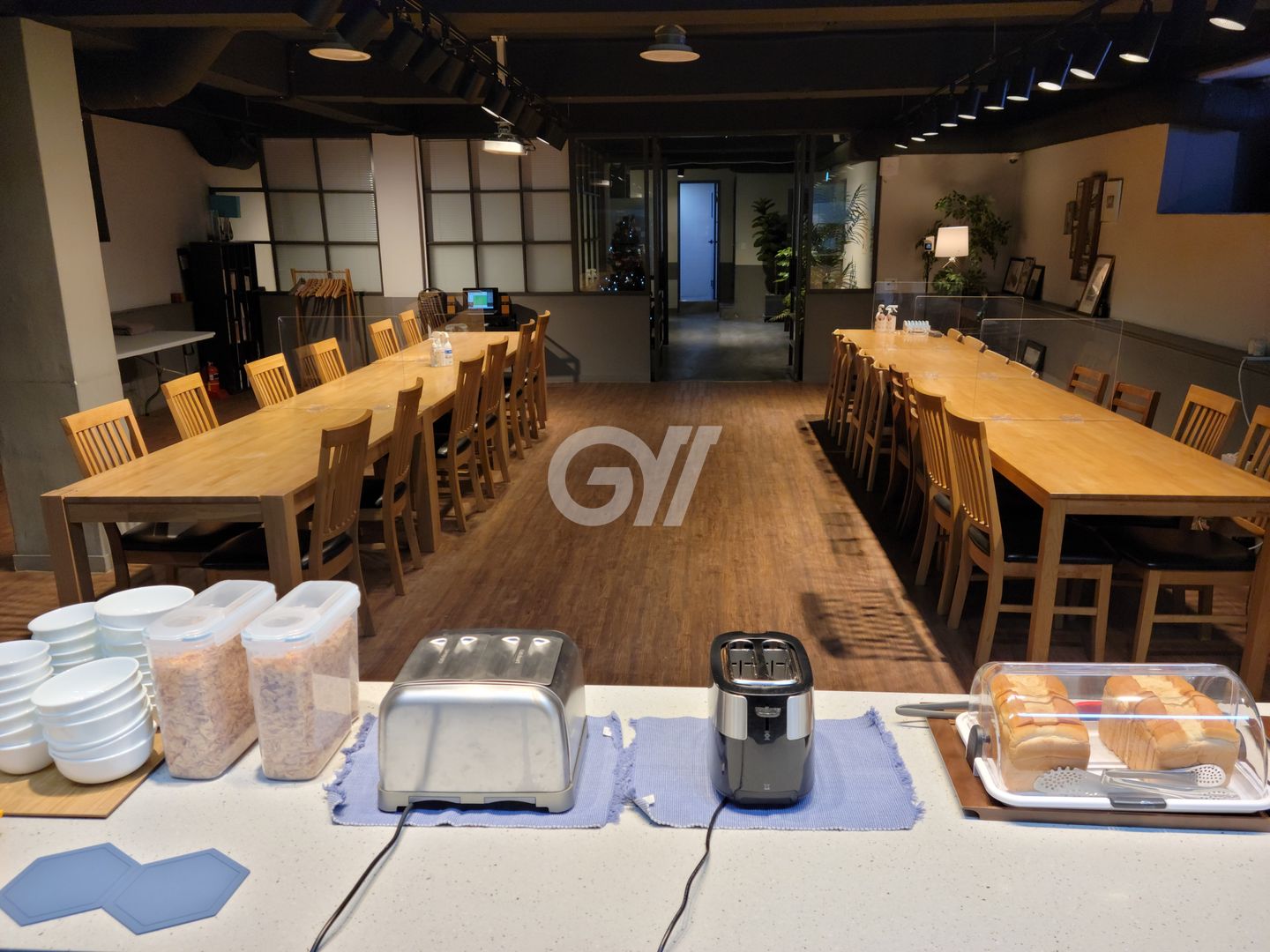 공용냉장고, 인덕션, 가스레인지, 전자레인지, 전기포트, 토스트기, 정수기, 조리도구, 식탁