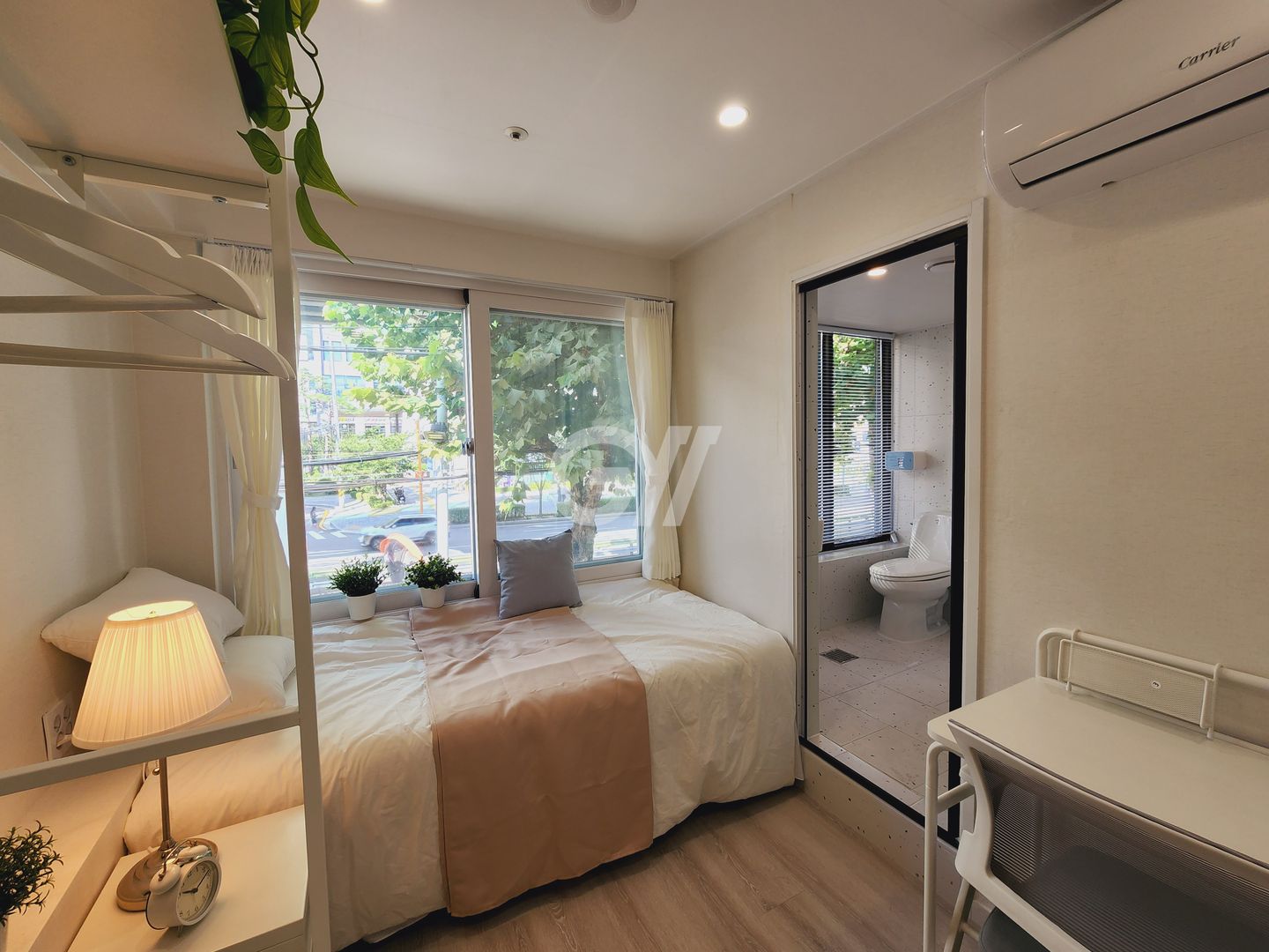 객실 내에는 화장실과 샤워시설을 갖춘 올 원룸형의 넓은 방으로 개별 에어컨과 드럼세탁기(건조기 겸용), 2도어 냉장고, 전자레인지, 책상, 의자, 수납장, 행거, 침대 및 초고속 인터넷 등을 풀옵션으로 갖추고 있습니다.