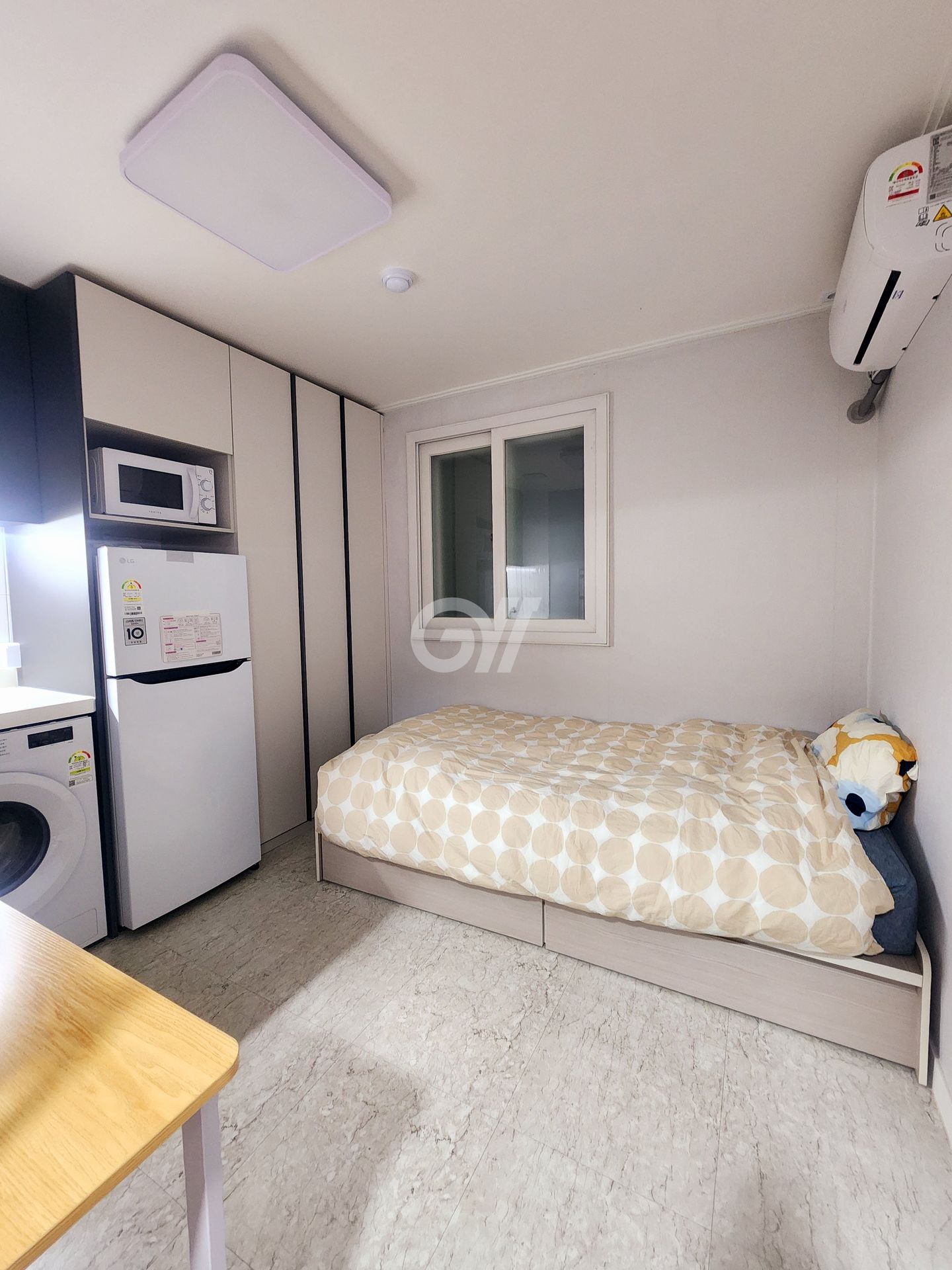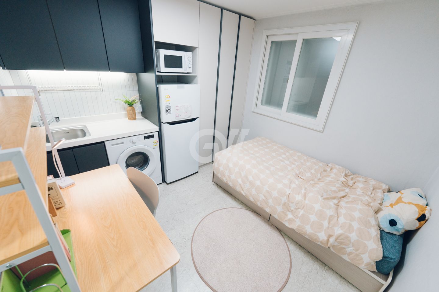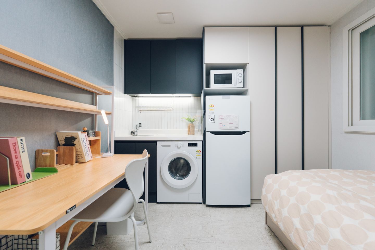 입주자를 위해 배치된 침대, 책상, 냉장고, 세탁기, 에어컨, 전자렌지, 붙박이장, 싱크대, 비데, 고급샤워기 등 뭐 하나 빠짐없는 풀옵션 룸!