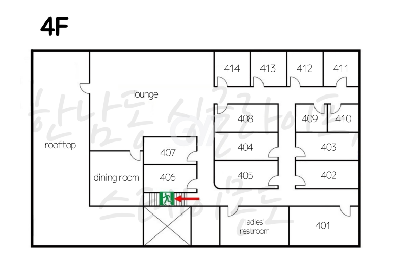 각 방에 샤워실과 화장실이 모두 없는 방 구조입니다. 공용샤워실과 공용화장실을 이용해야 합니다.