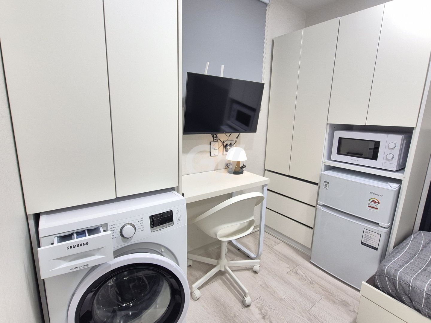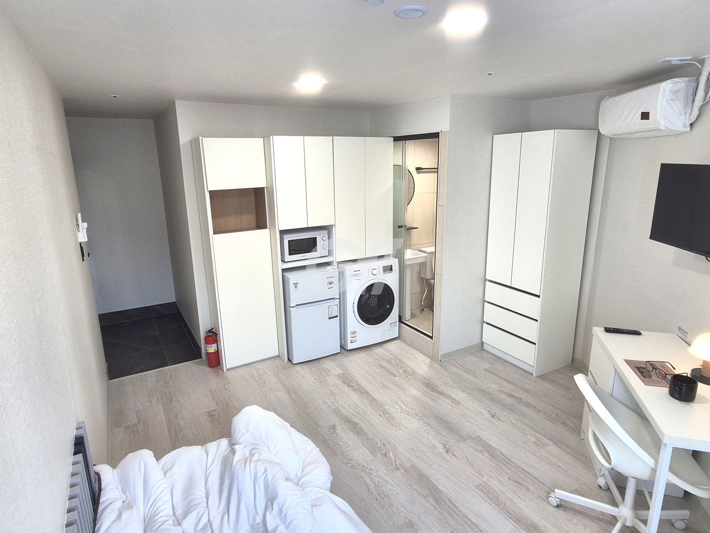 세탁기, 전자레인지, 책상, 의자, 옷장, 도어형 수납장 및 대형 신발장이 준비되어 있습니다.