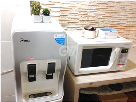 공용냉장고, 인덕션, 가스레인지, 전자레인지, 전기포트, 전기밥솥, 토스트기, 정수기, 조리도구, 식탁