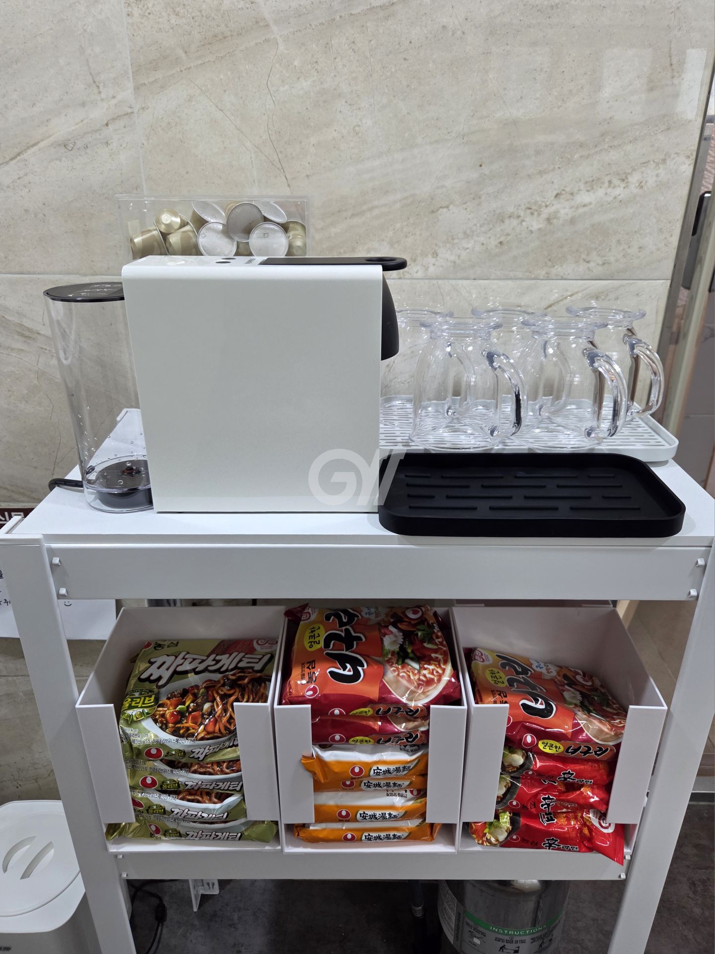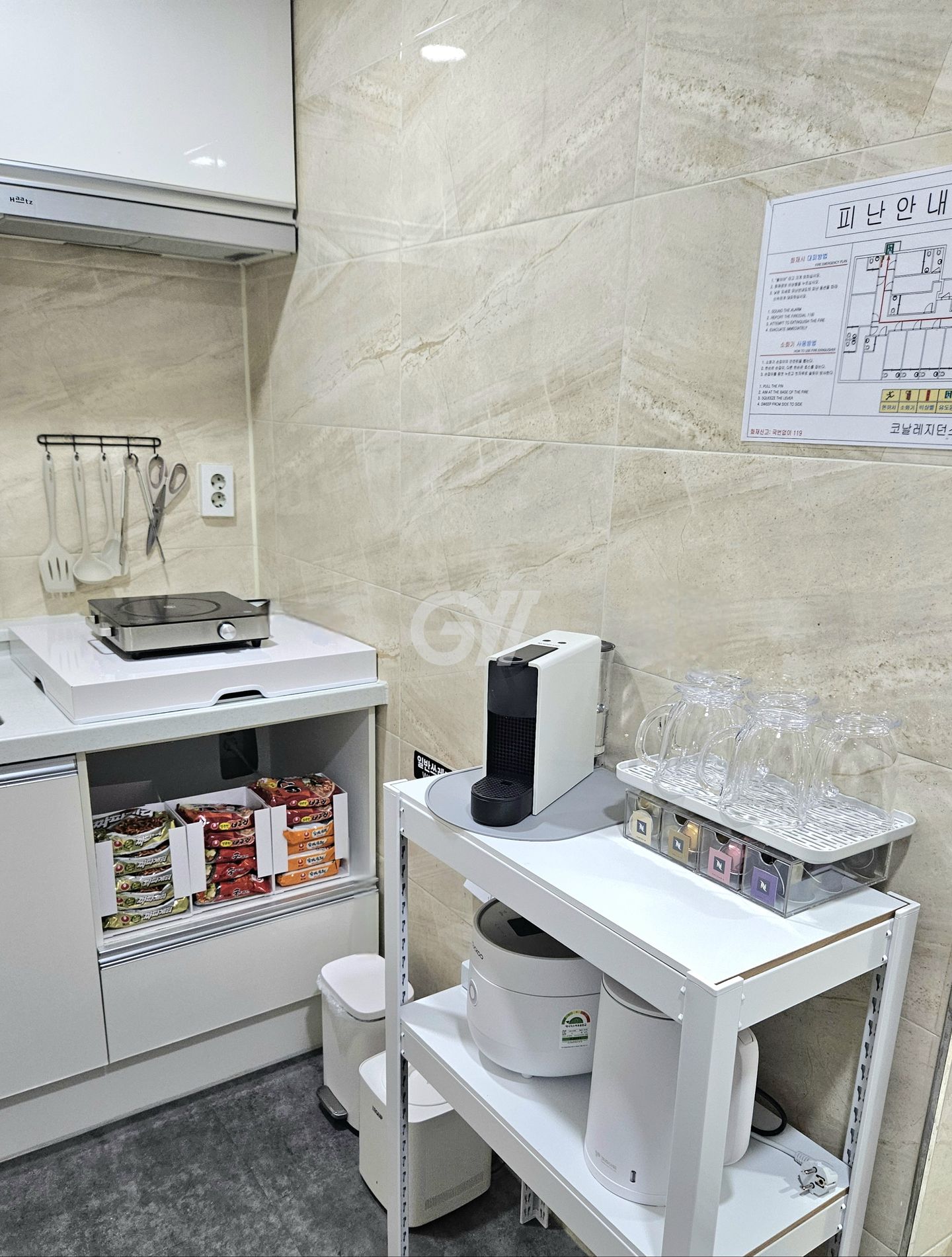 공용냉장고, 인덕션, 전자레인지, 전기포트, 전기밥솥, 커피머신, 정수기, 조리도구