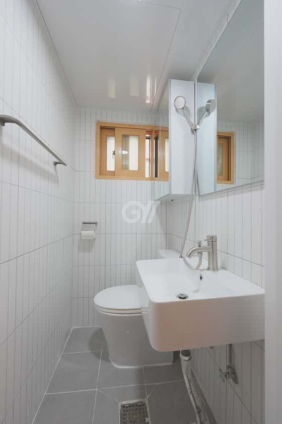 - 화이트톤 포세린 타일 화장실과 스커트형 양변기
