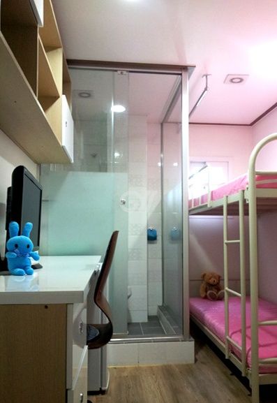 각 방에 샤워실과 화장실이 모두 없는 방 구조입니다. 공용샤워실과 공용화장실을 이용해야 합니다.