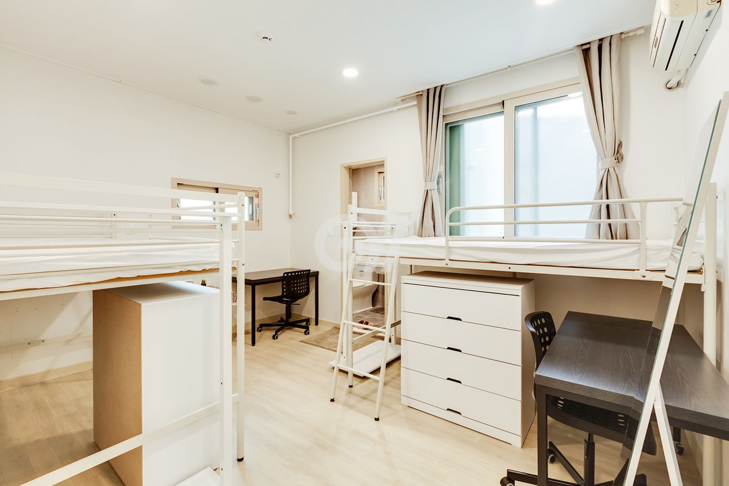 각 방에 샤워실과 화장실이 모두 없는 방 구조입니다. 공용샤워실과 공용화장실을 이용해야 합니다.