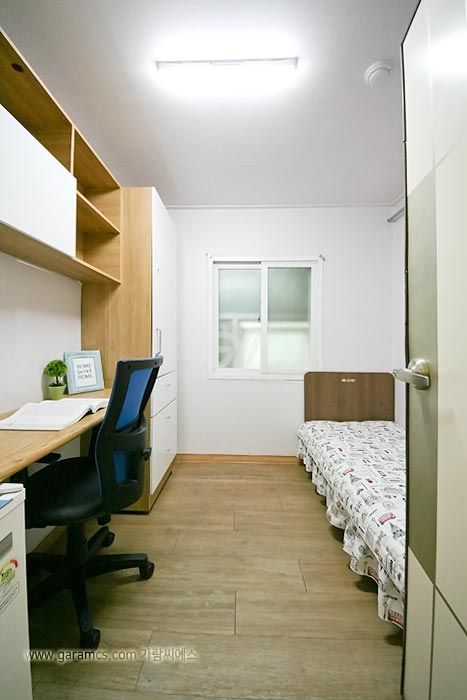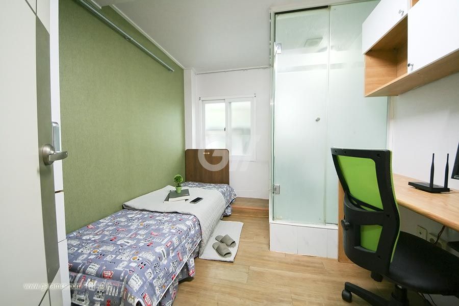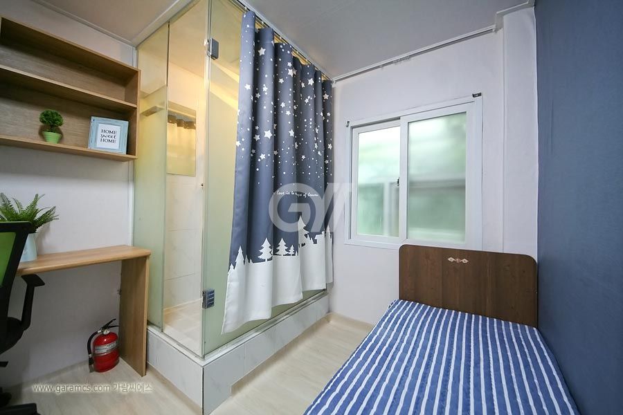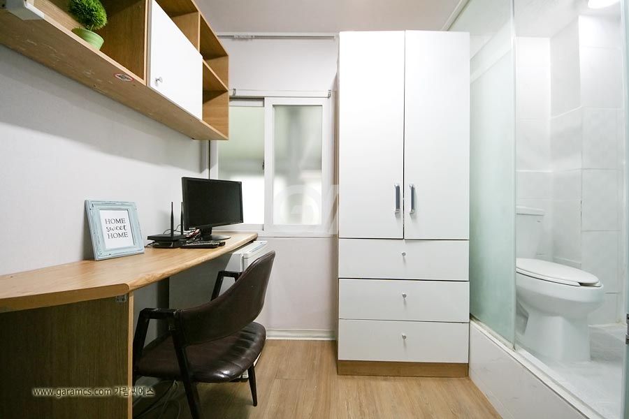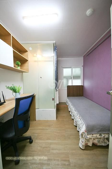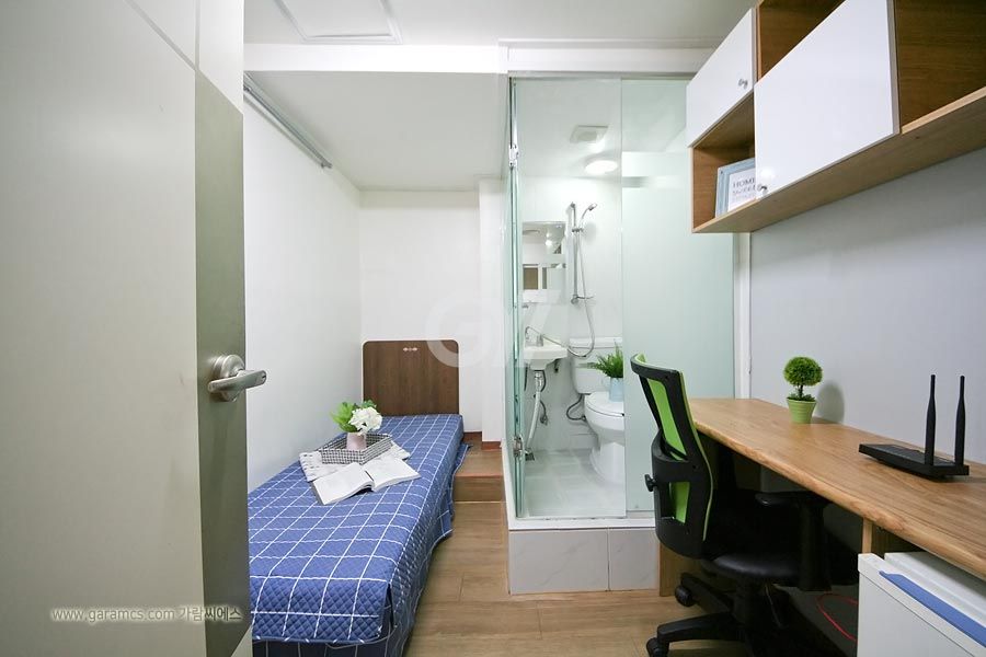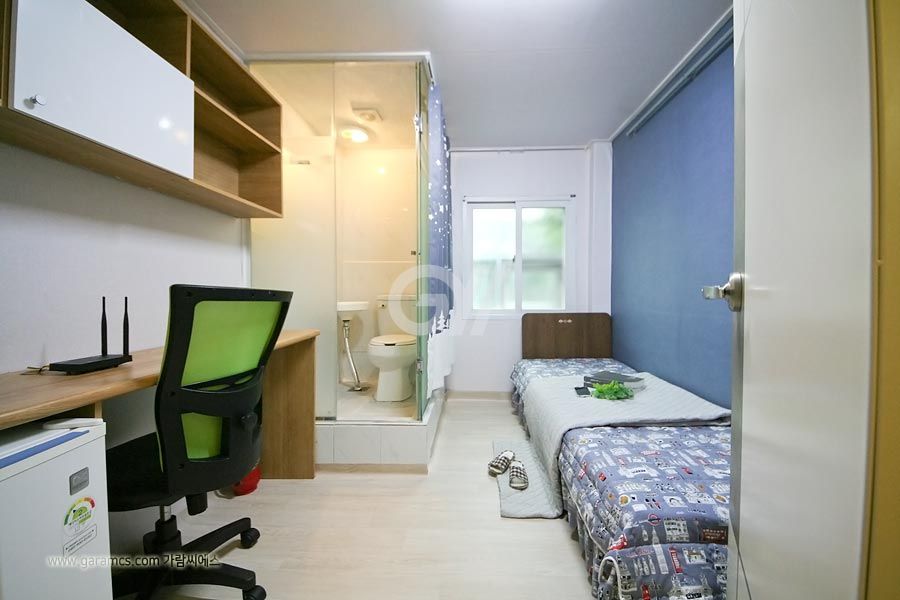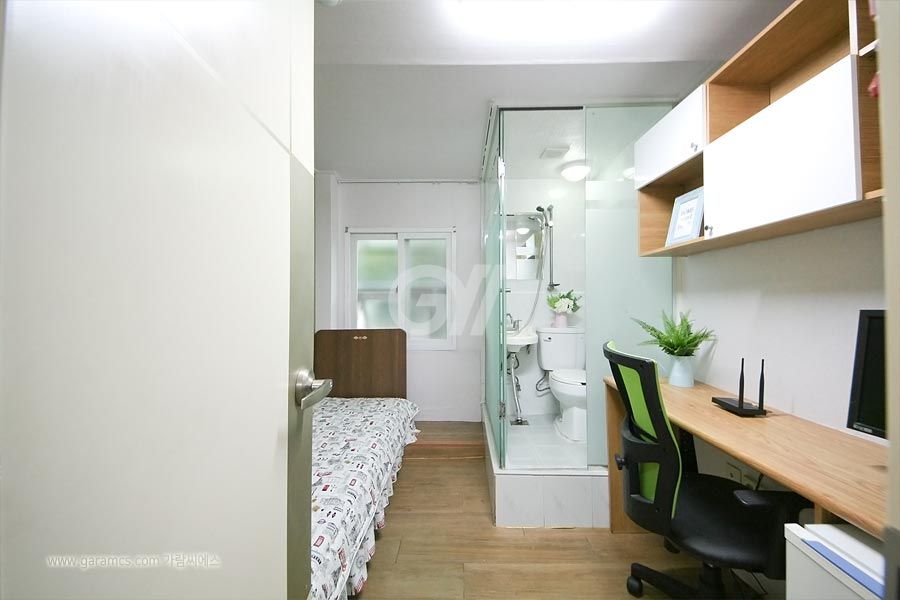 원룸방안에는 화장실 샤워실이 있고 옷장과 침대 책상과의자 개인냉장고와 초고속 개별와이파이가 설치되어있고 모니터 TV도 있습니다.