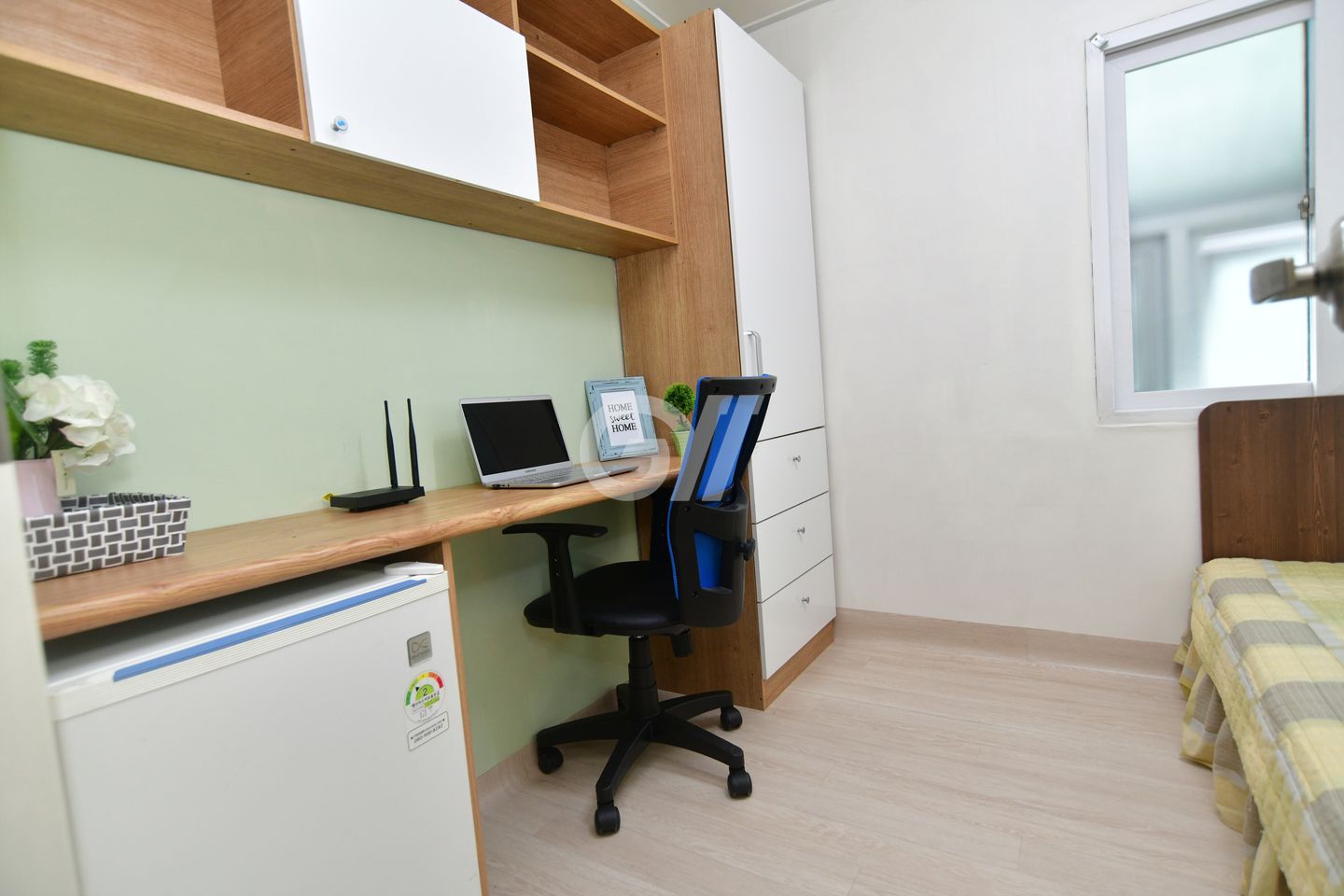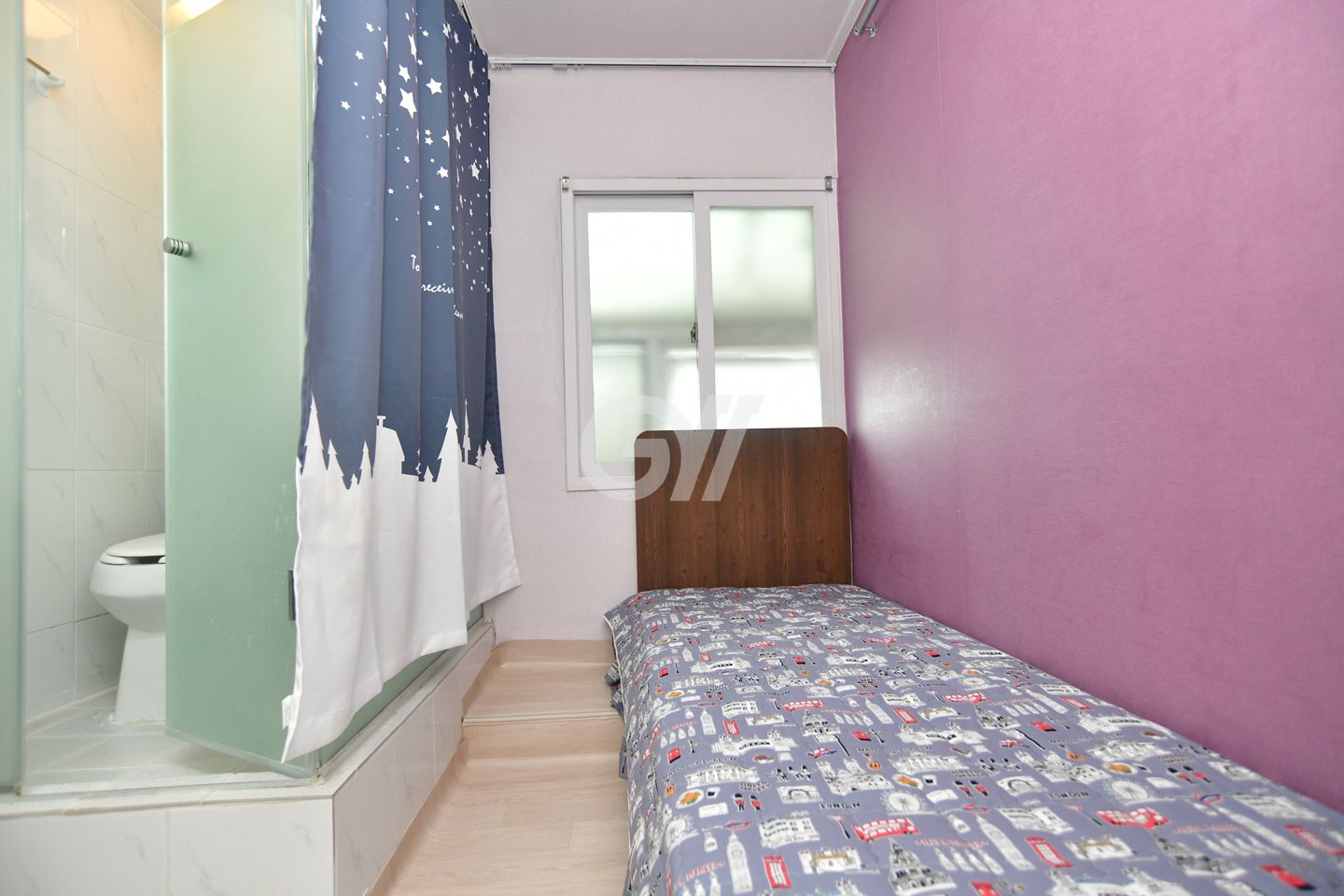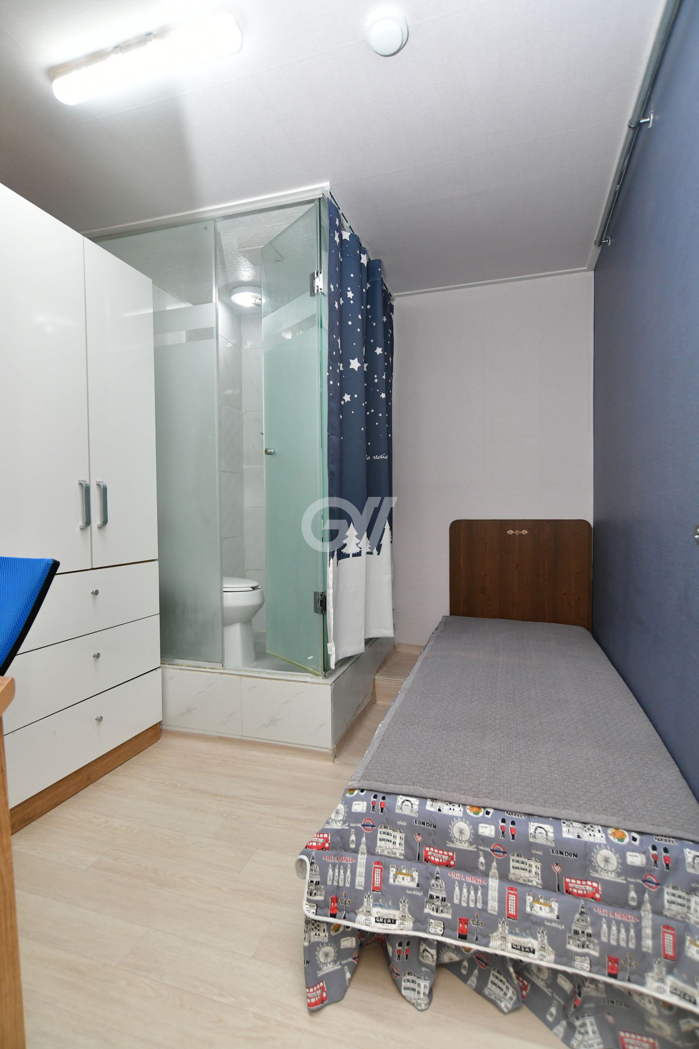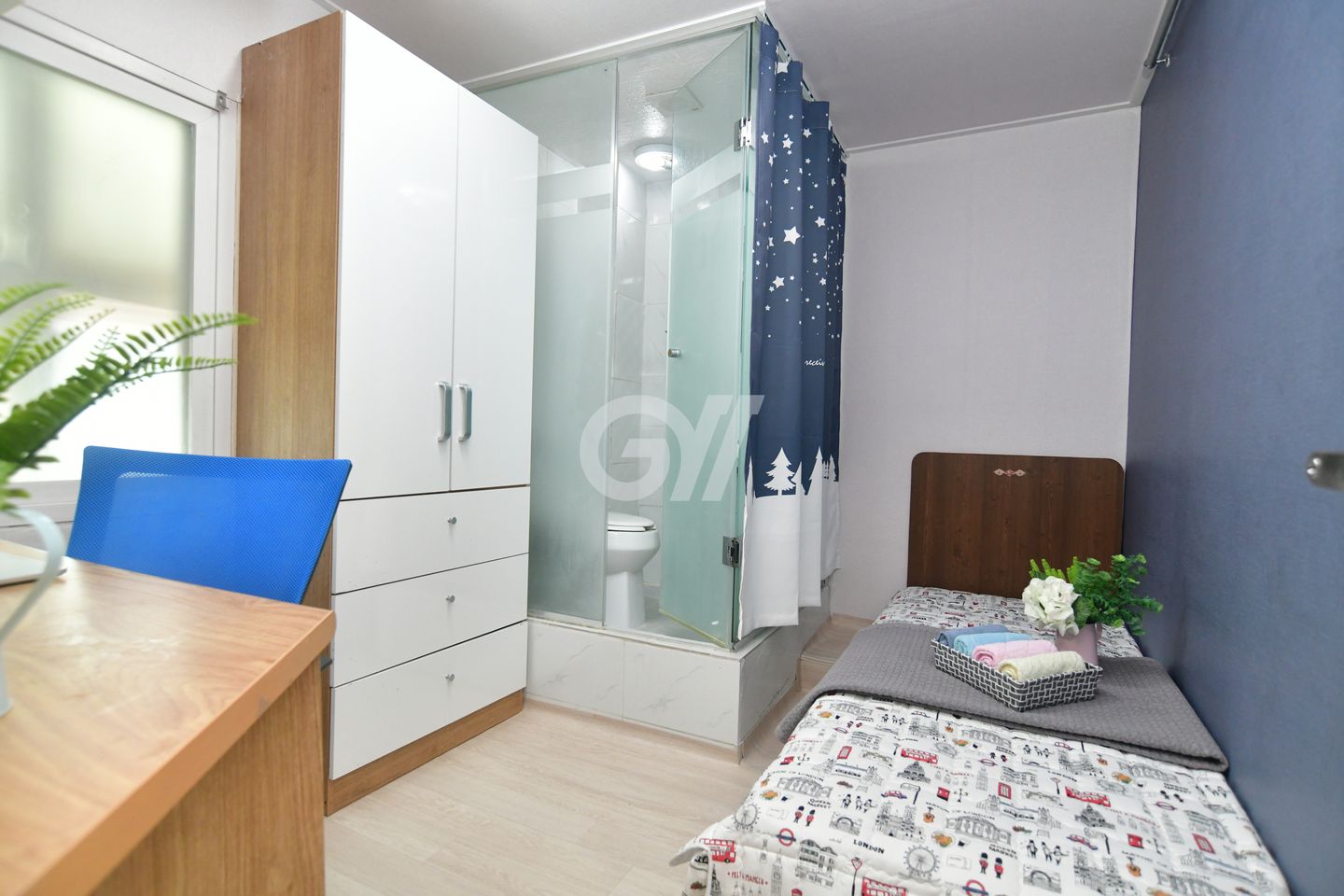 원룸방안에는 화장실 샤워실이 있고 옷장과 침대 책상과의자 개인냉장고와 초고속 개별와이파이가 설치되어있고 모니터 TV도 있습니다.