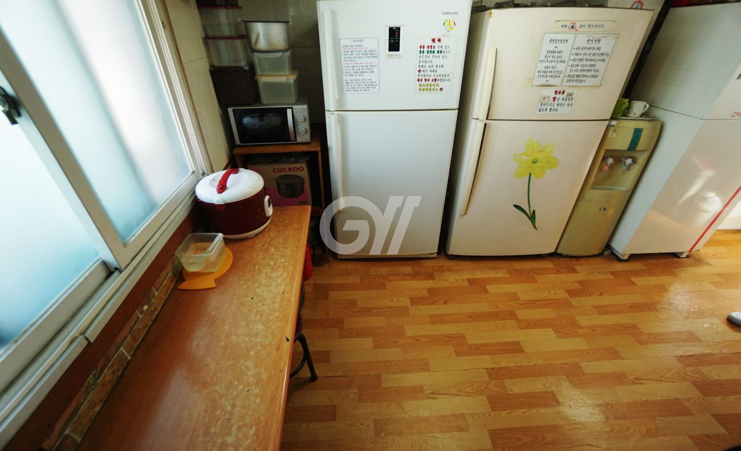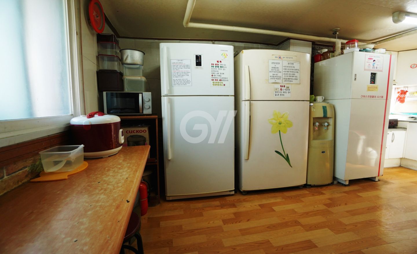 공용냉장고, 가스레인지, 전자레인지, 전기밥솥, 정수기, 조리도구, 식탁