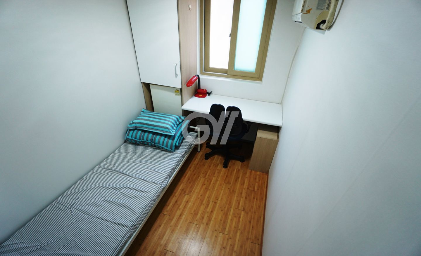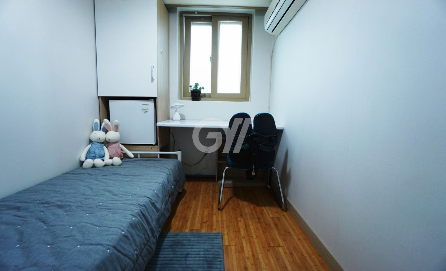 각 방에는 에어컨, 냉장고, 수납장, 옷장, 책상과 의자가 제공되며