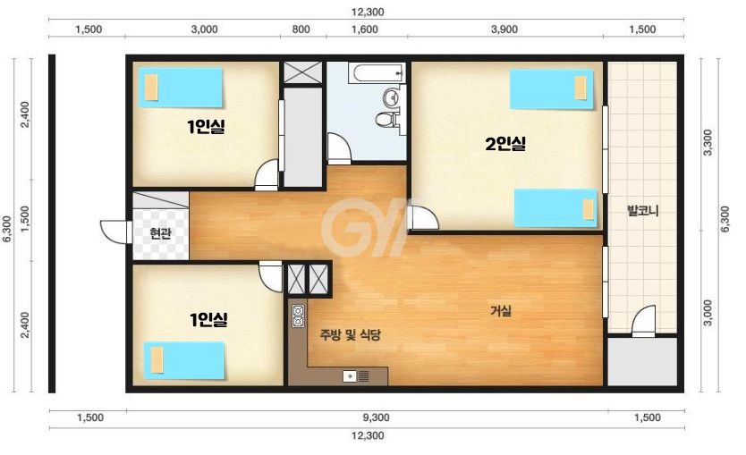 각 방에 샤워실과 화장실이 모두 없는 방 구조입니다. 공용샤워실과 공용화장실을 이용해야 합니다.