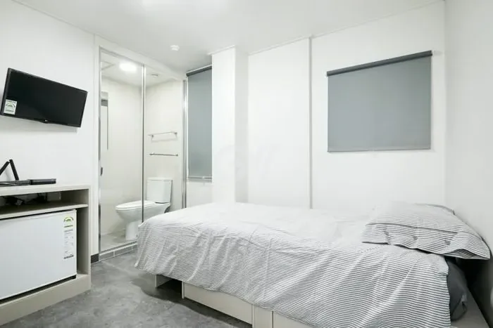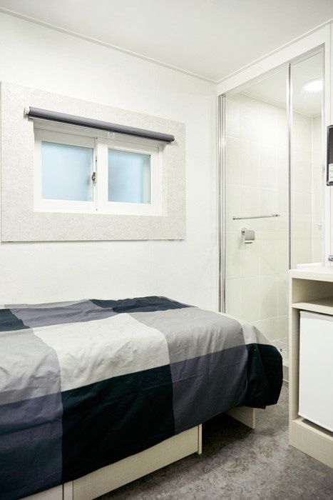 각 방에 샤워실과 화장실이 모두 없는 방 구조입니다. 공용샤워실과 공용화장실을 이용해야 합니다.