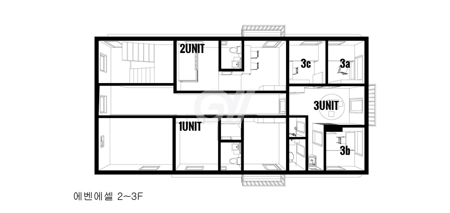 각 방에 샤워실과 화장실이 모두 있는 방 구조입니다.