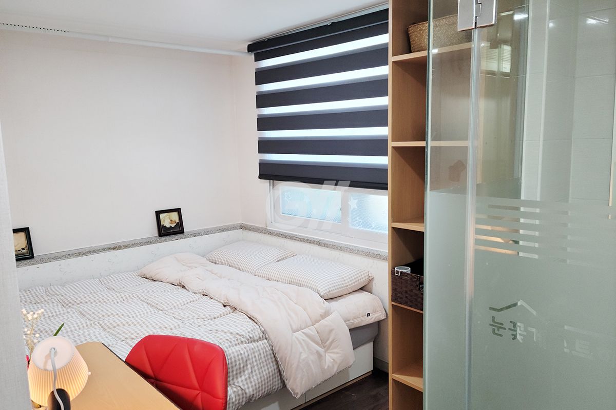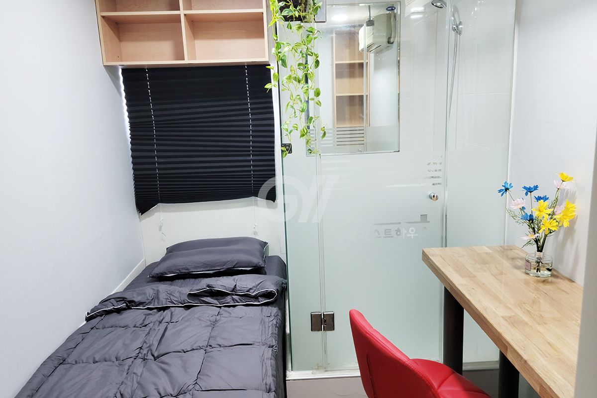 각 방에 샤워실과 화장실이 모두 없는 방 구조입니다. 공용샤워실과 공용화장실을 이용해야 합니다.