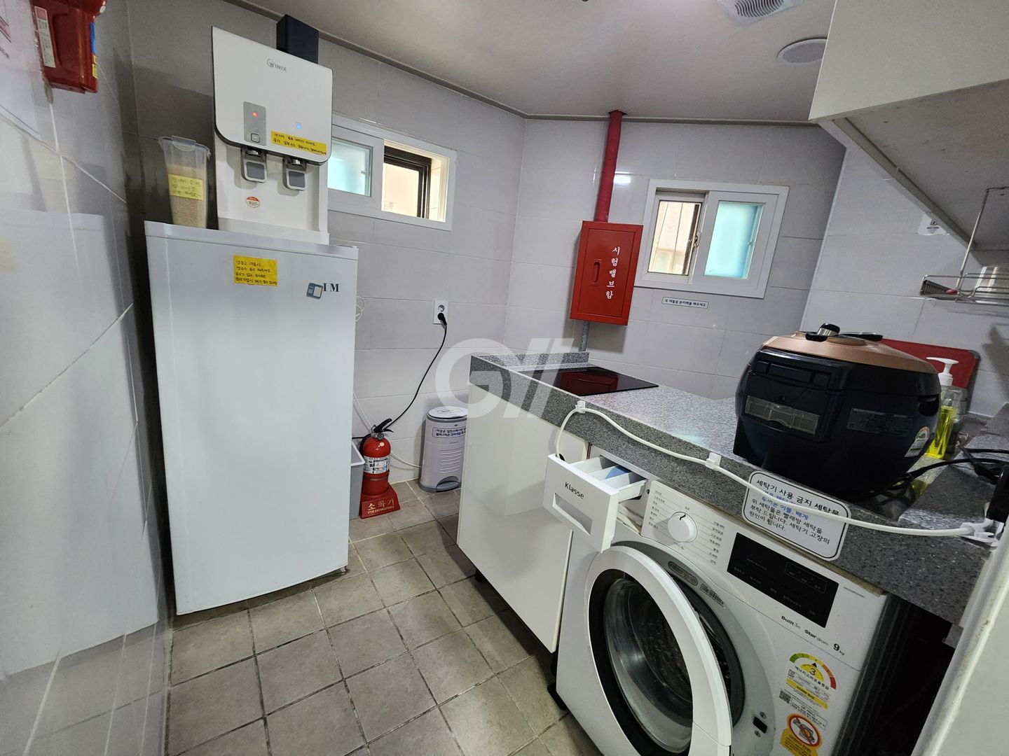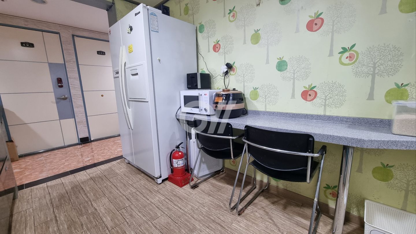 공용냉장고, 인덕션, 전자레인지, 전기밥솥, 토스트기, 정수기, 조리도구, 식탁